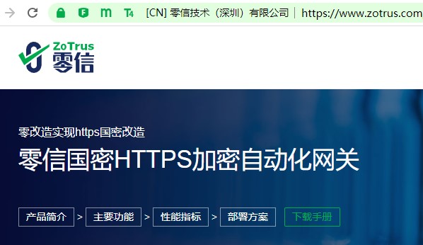 使用零信浏览器访问,会优先采用国密SM2算法实现https加密,浏览器会显示加密锁标识和国密加密标识